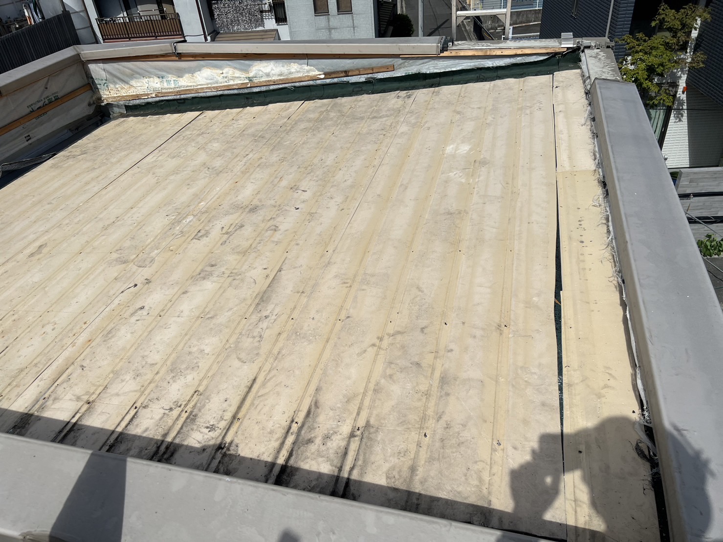めくって野地板を張り、ルーフィング・立平に施工しました。
